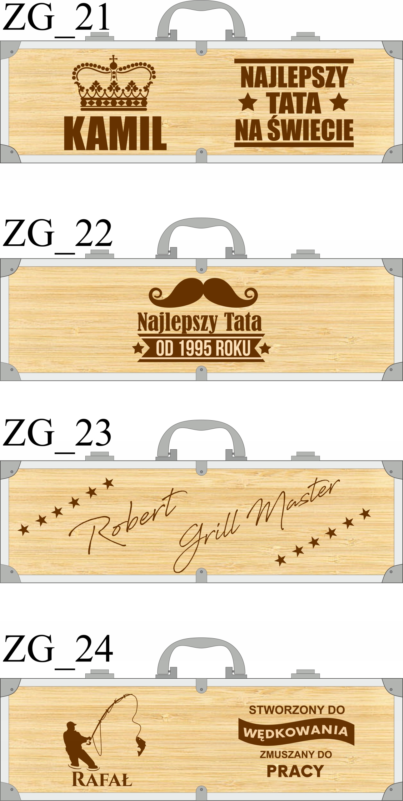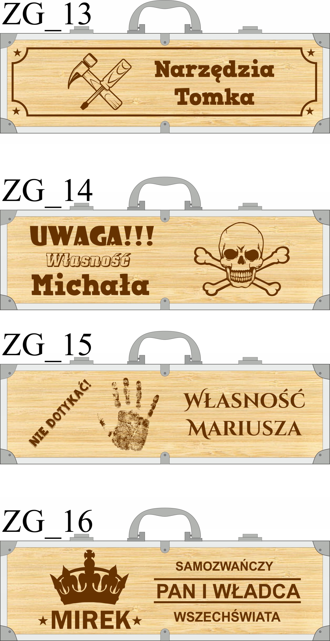 Po dodaniu przedmiotu do koszyka w polu „uwagi do zamówienia” podać numer wzoru skrzynki, akcesoria, imię, ewentualnie inne informacje które są widoczne we wzorach i są niezbędne do realizacji zamówienia