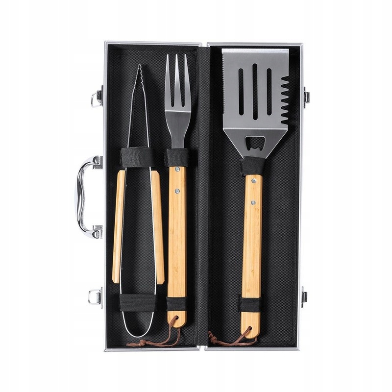 3-częściowy zestaw do grilla w poręcznej walizce ze wstawkami z bambusa. Wewnątrz znajdują się szczypce, widelec do mięsa i szpatułka z otwieraczem do kapsli