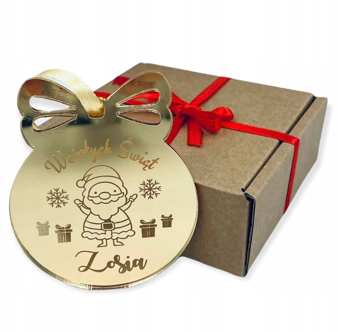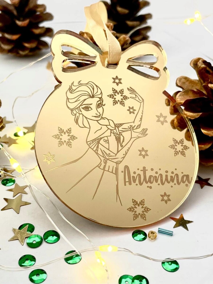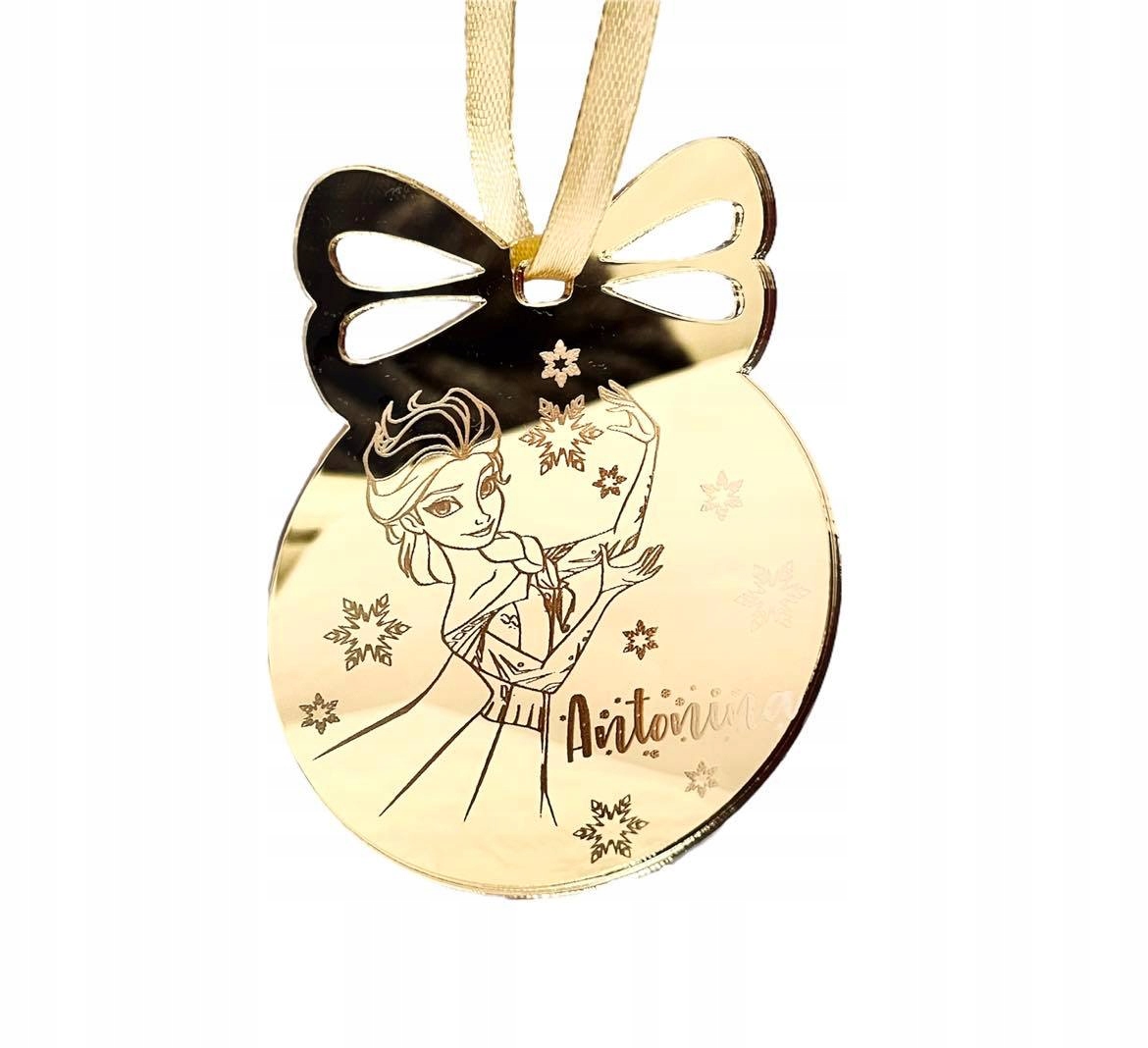 Personalizowana bombka w kolorze złote lustro świetnie sprawdzi się jako wyjątkowa dekoracja na choinkę lub prezent dla najmłodszych.