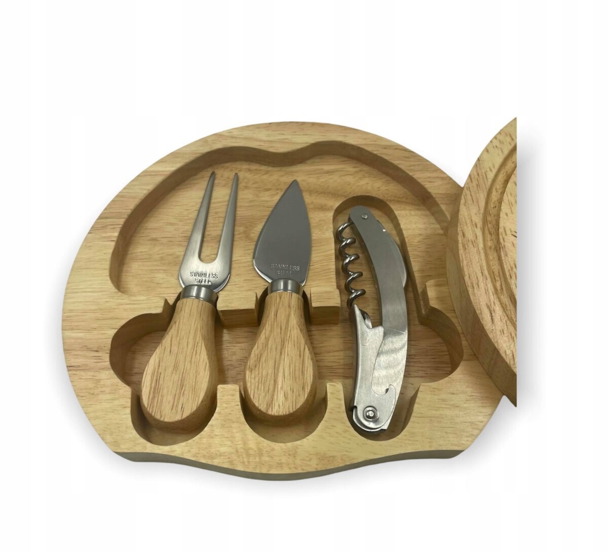 • Deska ma nietuzinkową budowę, ponieważ górna część, która przeznaczona jest do wyłożenia przekąsek, jest przesuwana. Po przesunięciu jej na bok ukazuje się druga warstwa deski. Tam natomiast jest specjalne miejsce na sztućce. W otworze, który kształtem pasuje do akcesoriów, znajdują się: nóż i szpikulec do przekąsek. Mają one rękojeści z drewna, identycznego, z którego wykonana jest sama deska. Nożyki są ze stali nierdzewnej. Zestaw uzupełnia wielofunkcyjny otwieracz, przede wszystkim do wyciągania korka z butelki wina.