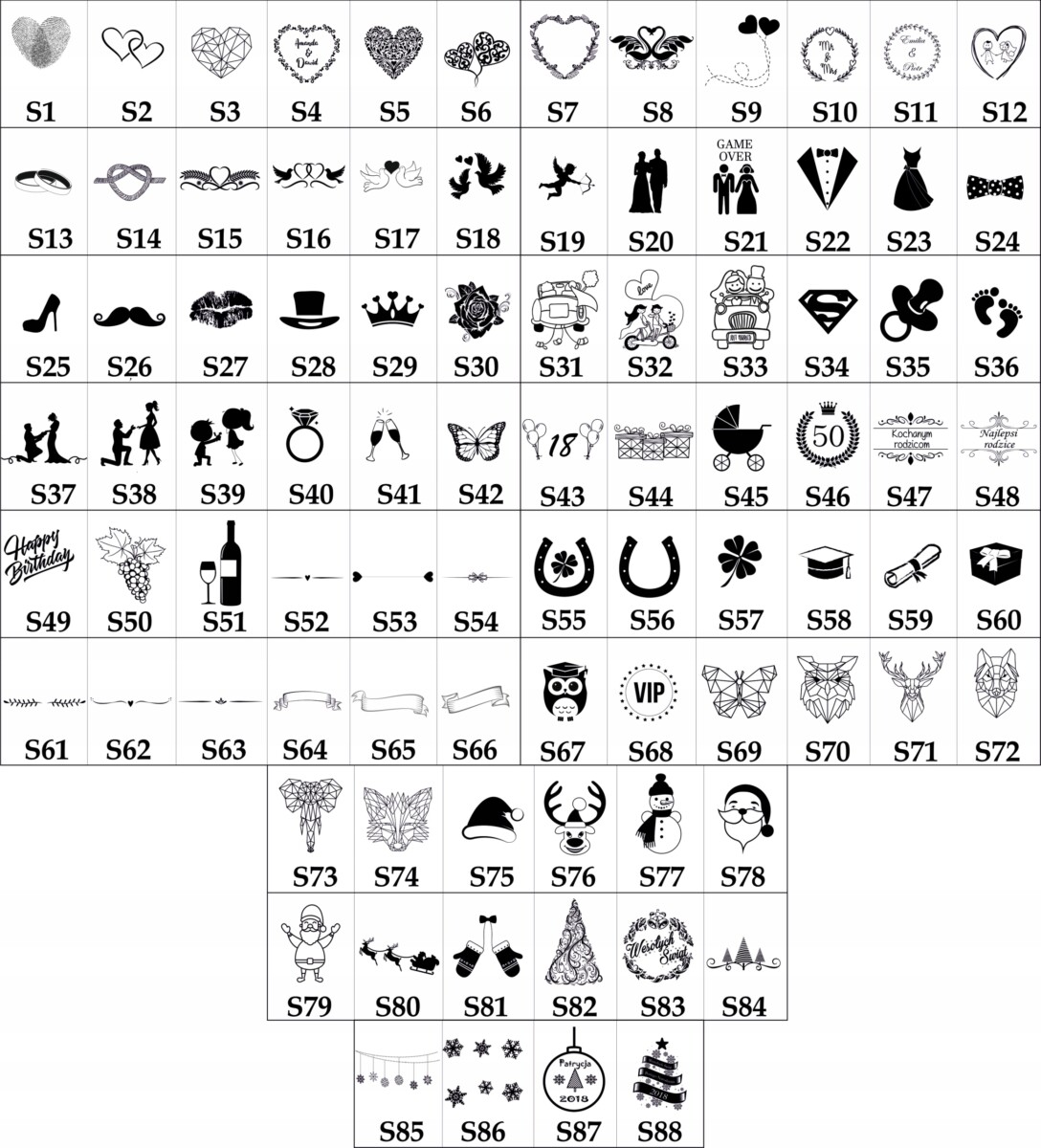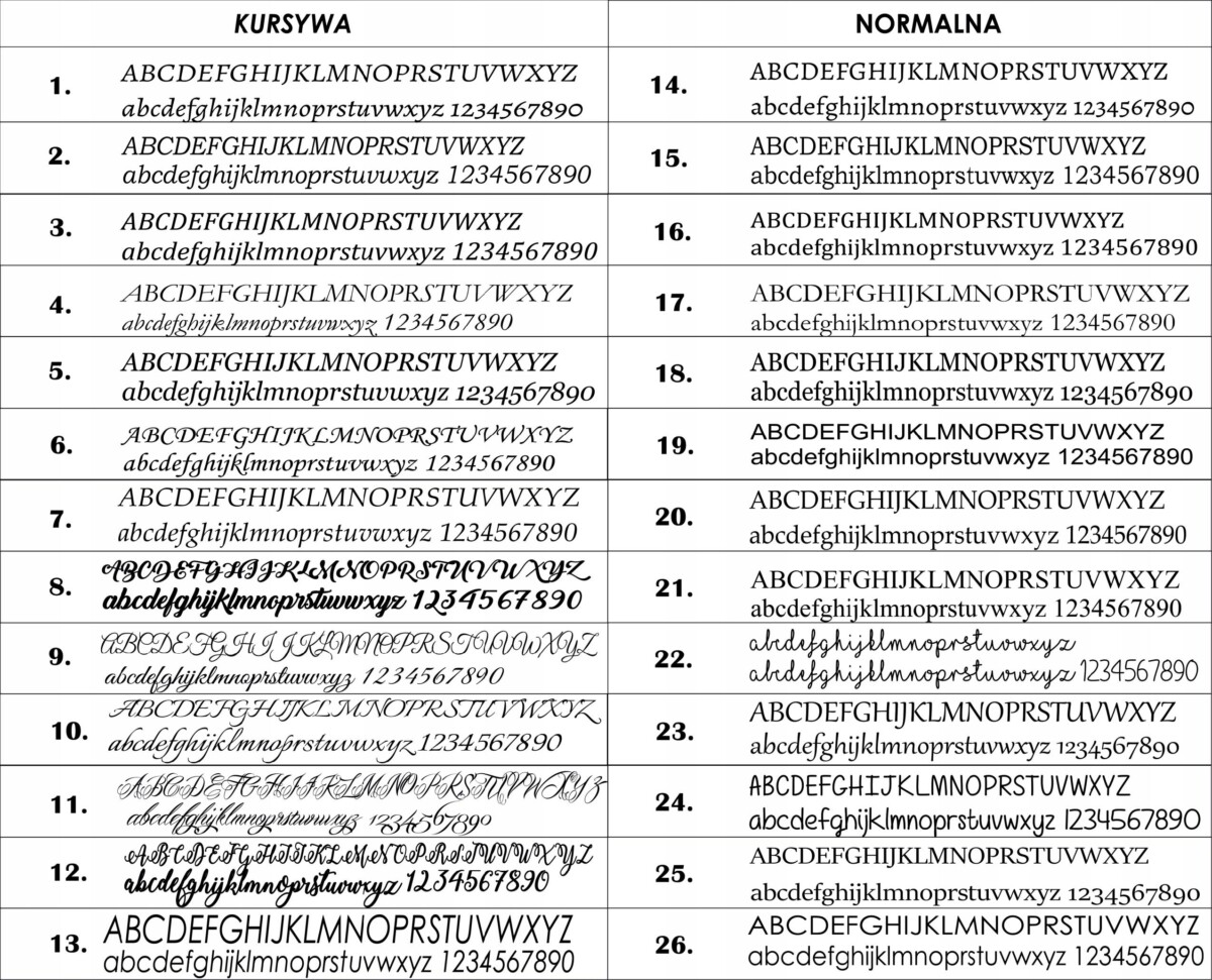 Poniżej duży wybór symboli, które możemy wygrawerować i zamieścić na naklejce, także wybór czcionki jaką mamy wygrawerować zyczenia, dedykację lub napis.