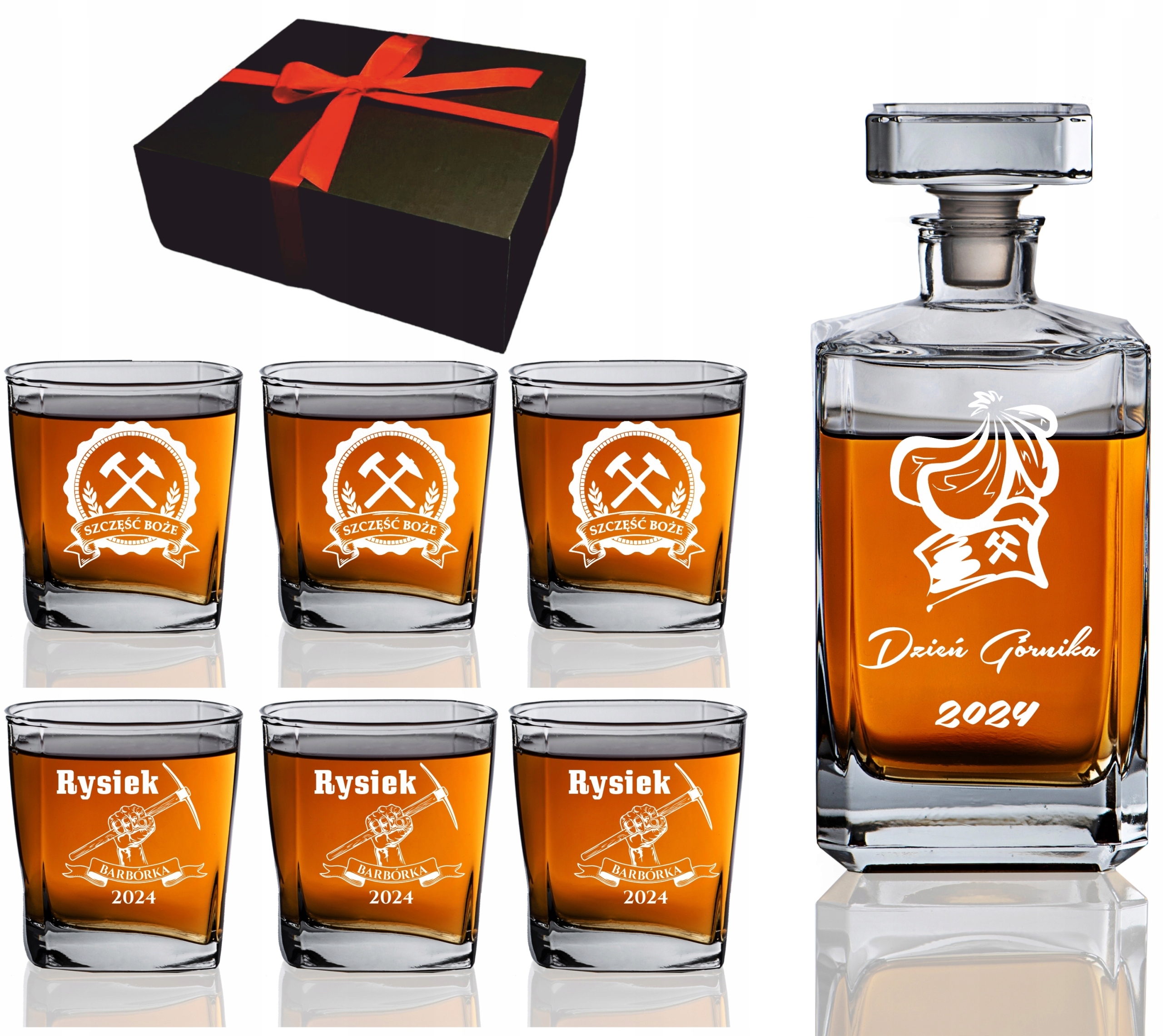 • KARAFKA 6 SZKLANEK Z GRAWEREM DO WHISKY DZIEŃ GÓRNIKA BARBÓRKA ŚWIĘTA