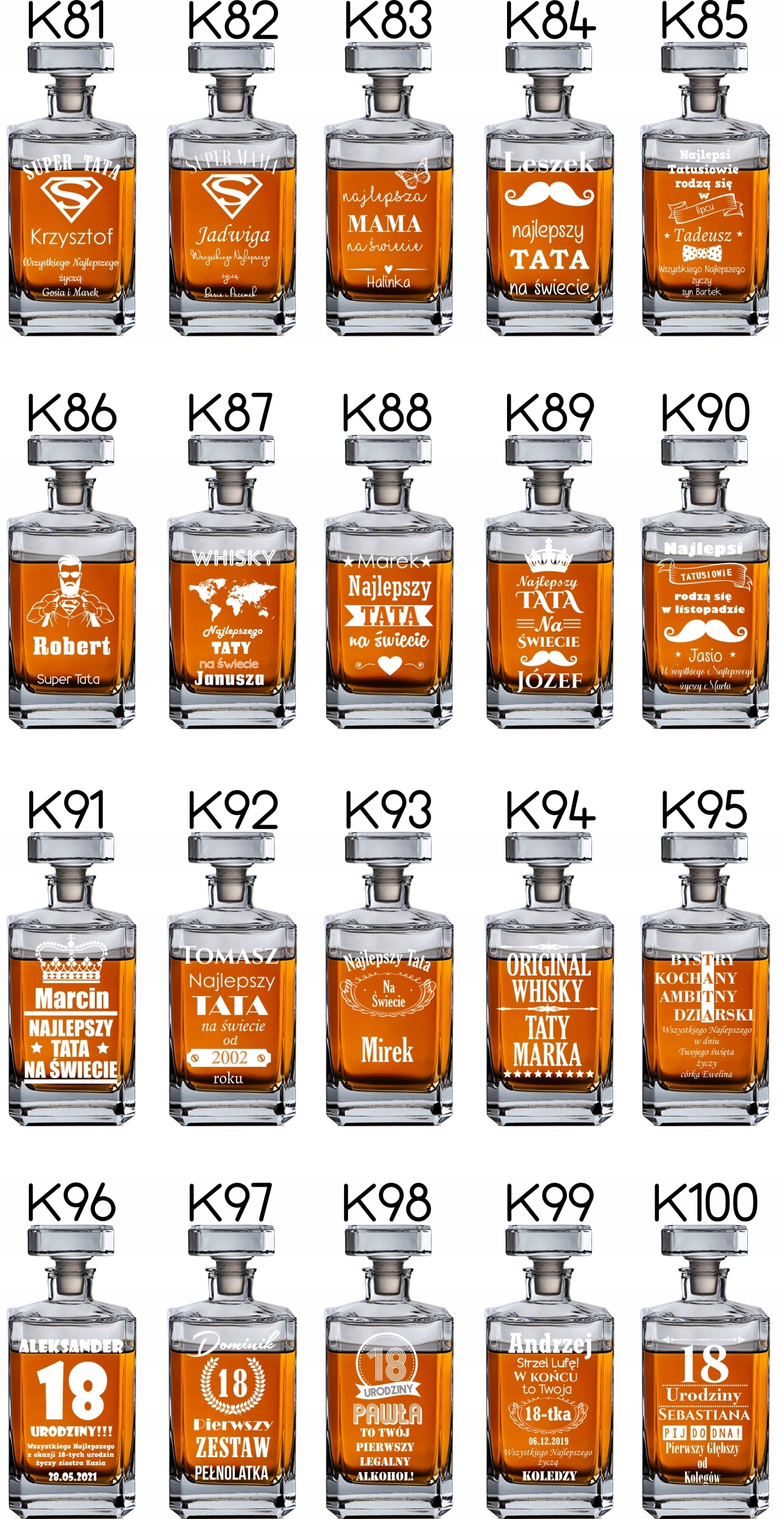Wszystkie podane przykłady można edytować lub mieszać na własny dowolny sposób np. zamiast najlepszy tata wykonać najlepszy dziadek brat etc. Wystarczy przy zamówieniu wysłać nam wytyczne a my wykonamy zamówienie według podanych wytycznych!Opis Karafki do whisky