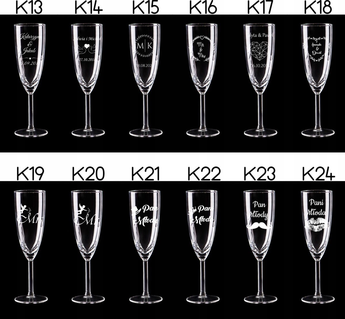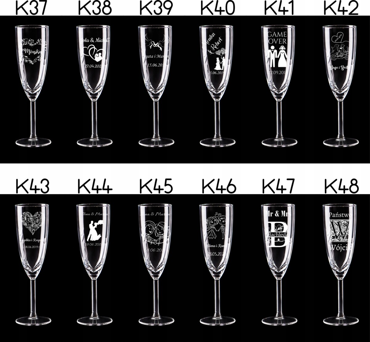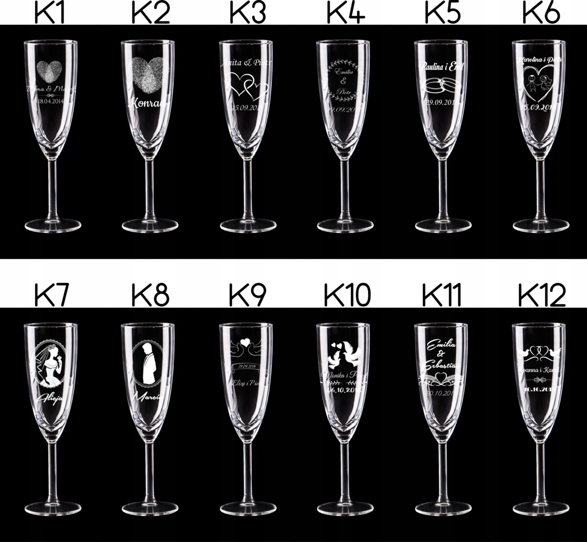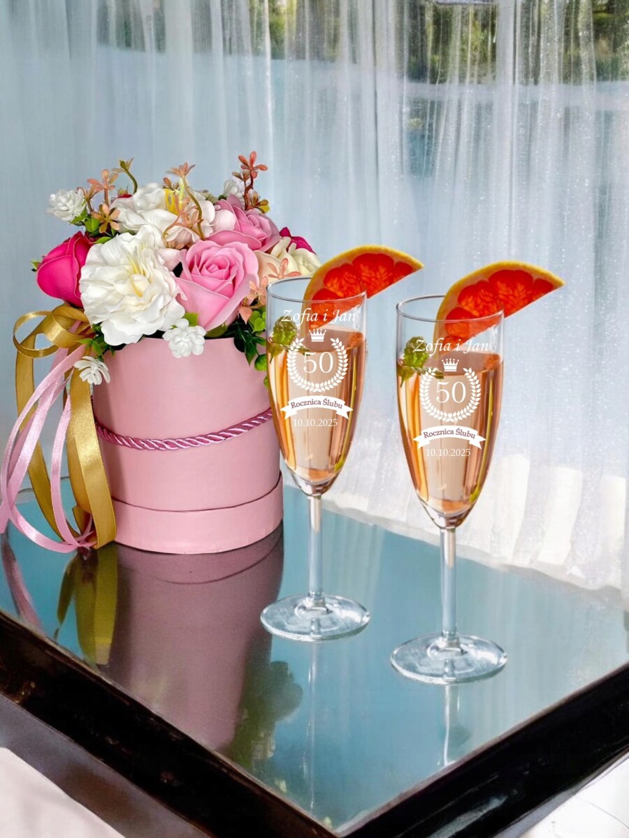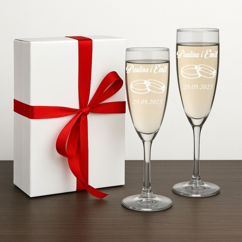 Przedmiotem aukcji jest komplet kieliszków do szampana z grawerem – 2 sztuki