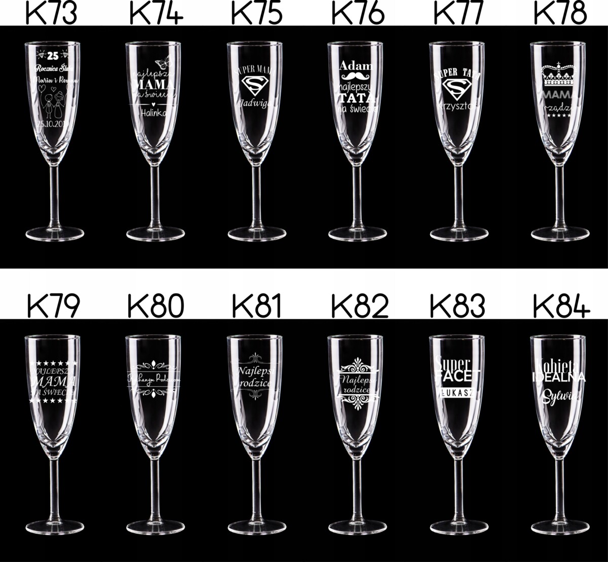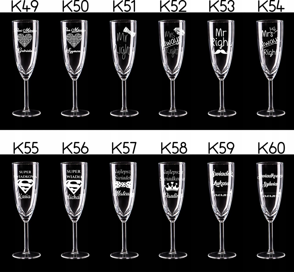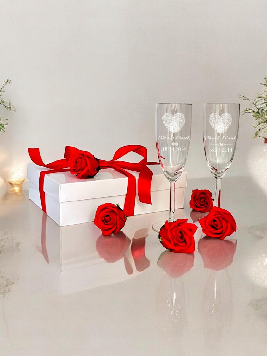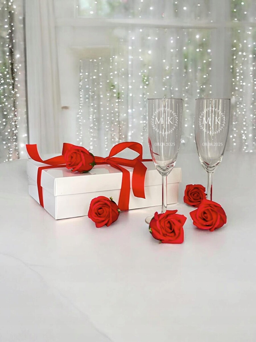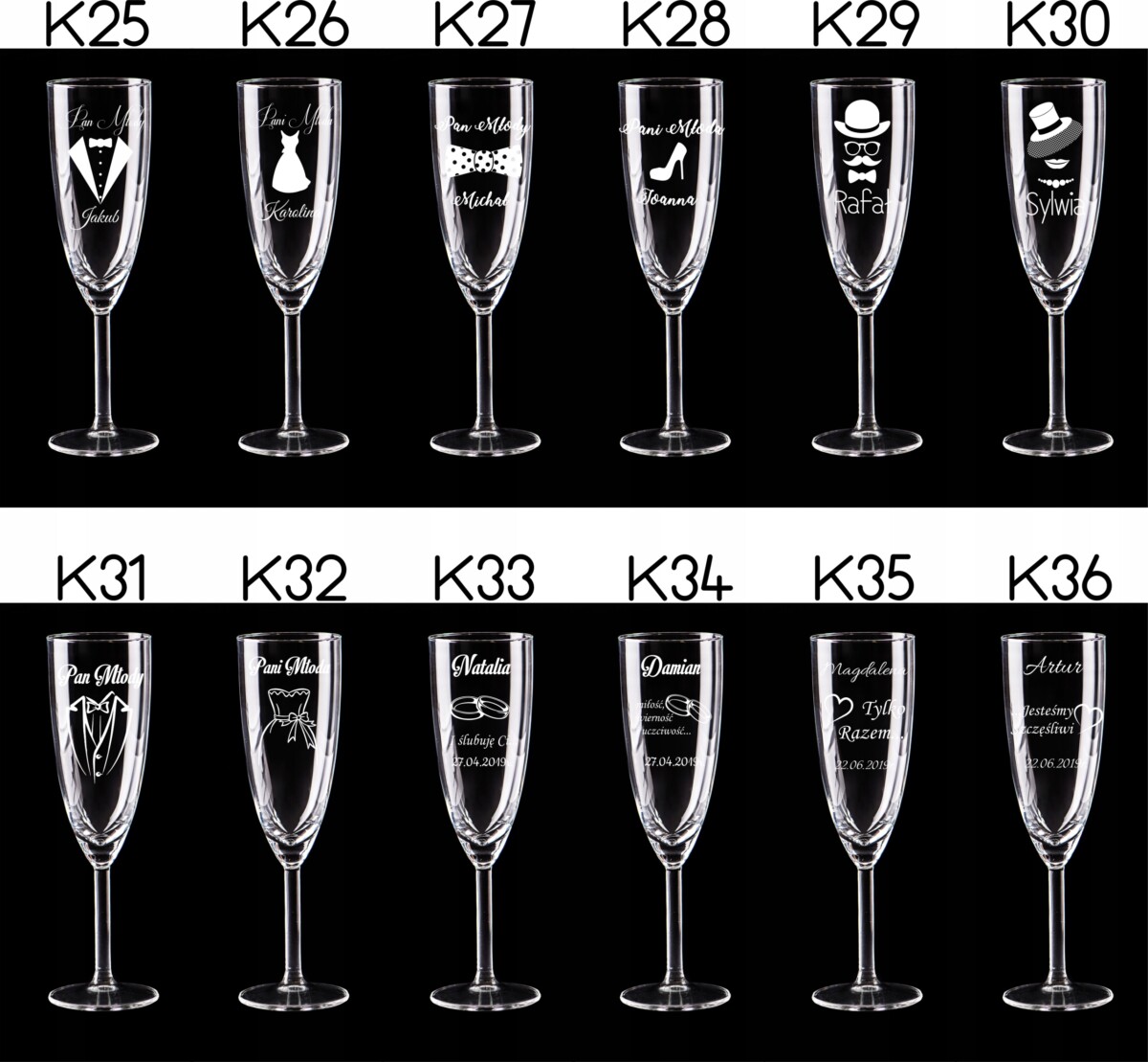 Przedmiotem aukcji jest komplet kieliszków do szampana z grawerem – 2 sztuki