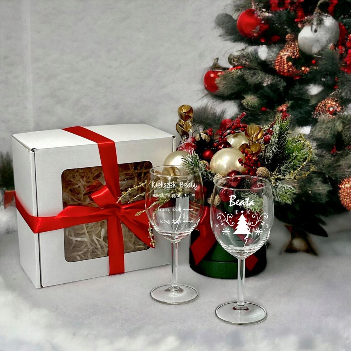 • Kieliszki zapakowane w pudełko prezentowe z okienkiem wraz z czerwoną wstążką ( wstążka pakowana luzem do opakowania)