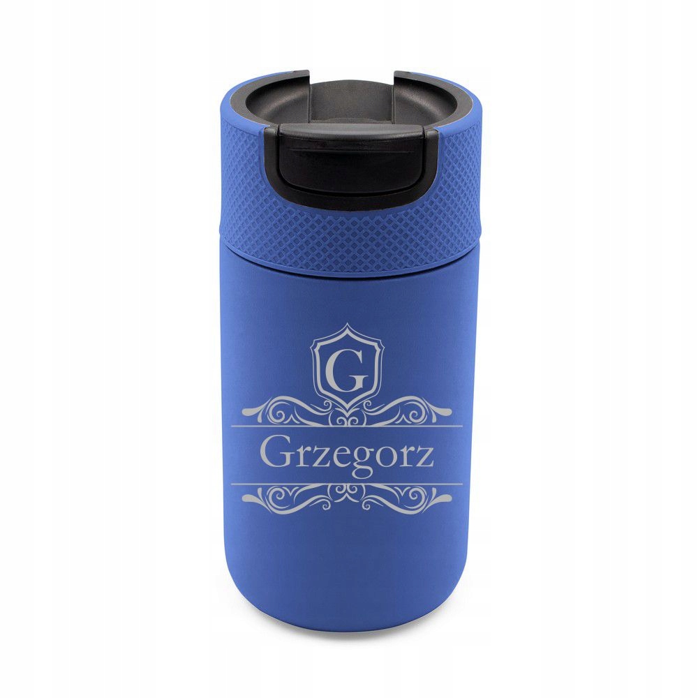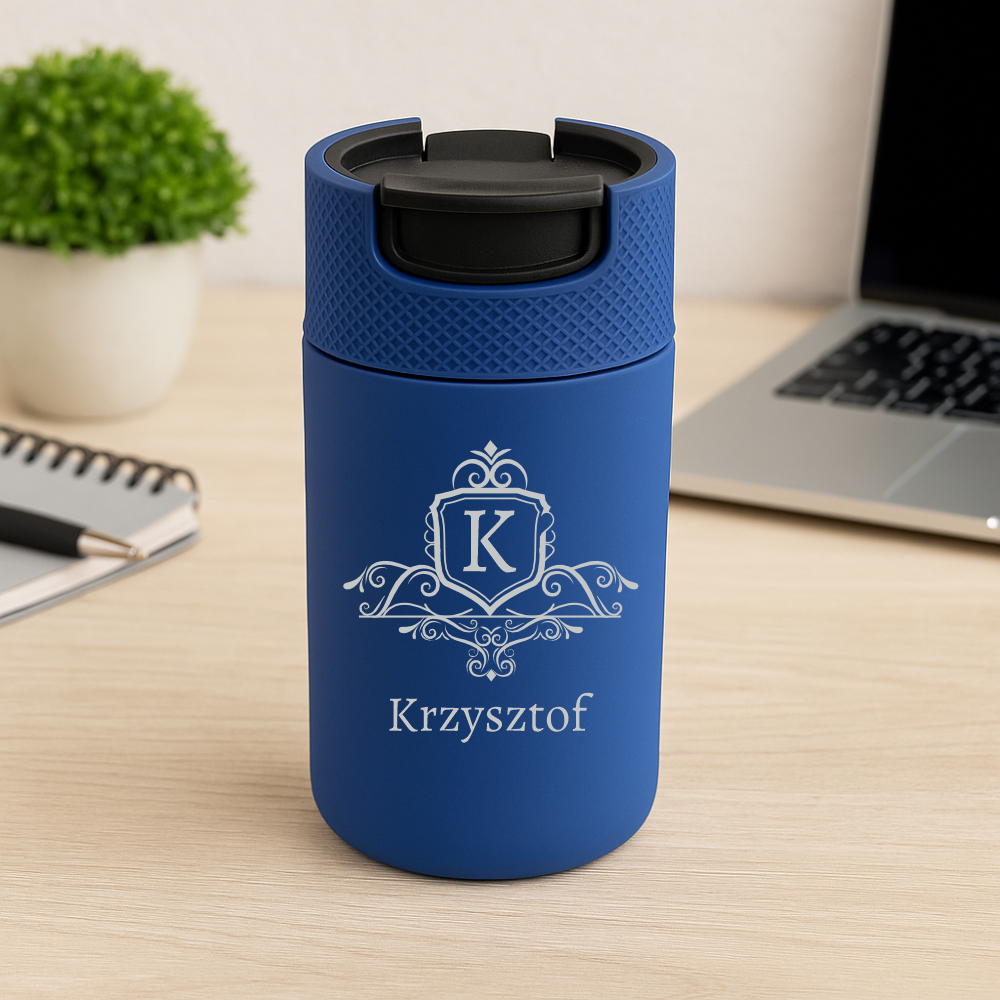 Kubek termiczny w kolorze NIEBIESKIM o pojemności 400 ml z grawerem, który będzie pasować do większości ekspresów do kawy!