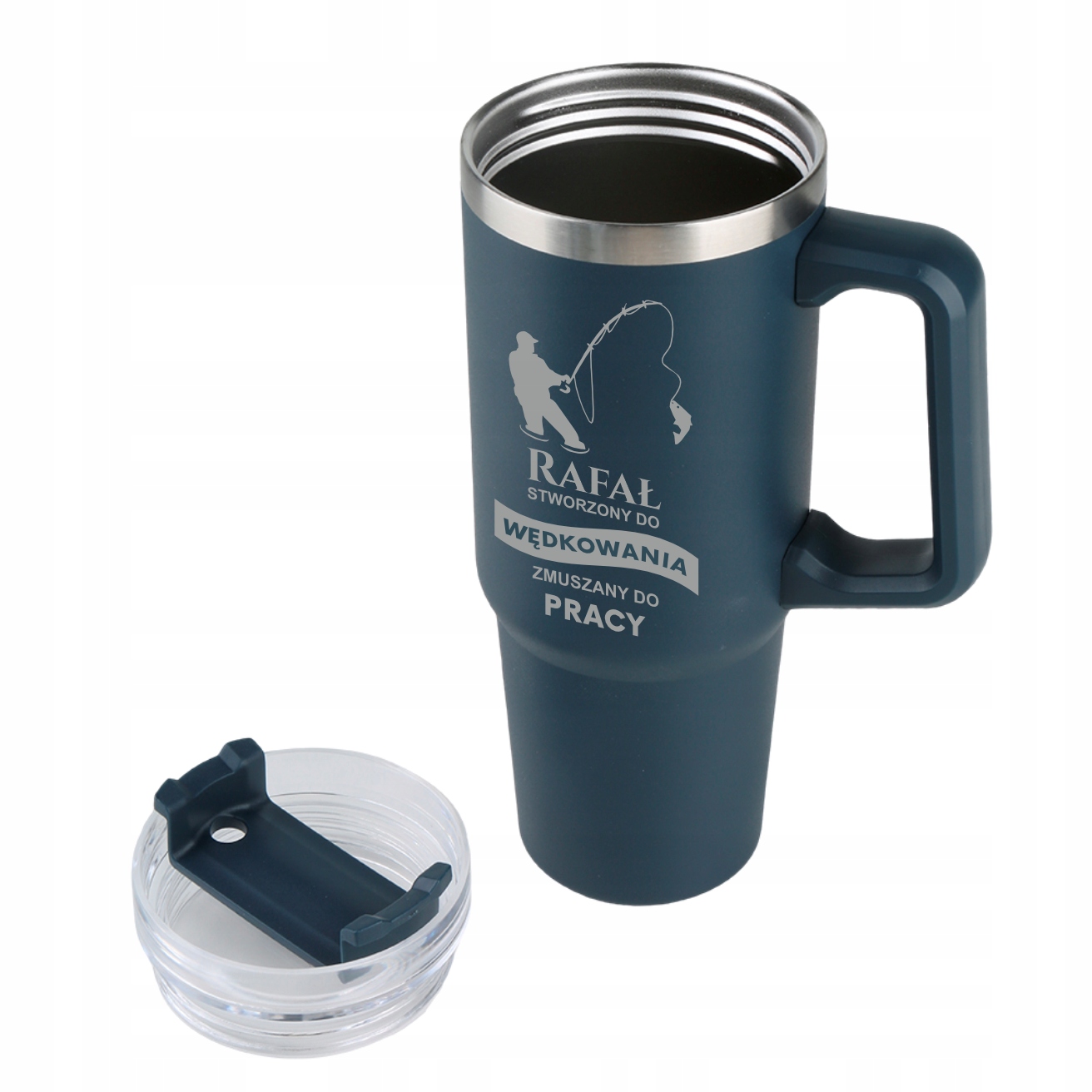 Kubek termiczny ze słomką i uchwytem 880 ml z grawerem w kolorze granatowym, trzyma ciepło do 8 godzin.