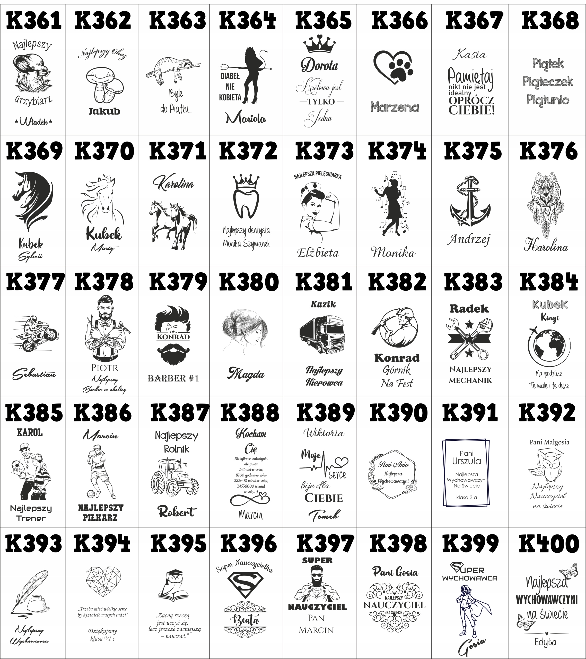 • w wiadomości do sprzedającego napisz numer wzoru np K3 imię Janusz lub data czy własny tekst w zależności do wybranego wzoru
