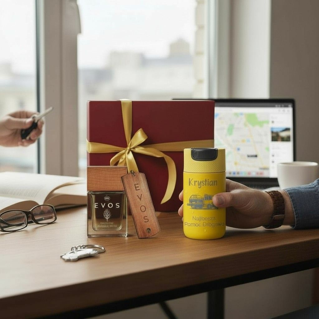 • Kubek termiczny z grawerem – utrzymuje napój gorący lub zimny, a personalizowany grawer sprawia, że jest wyjątkowy.