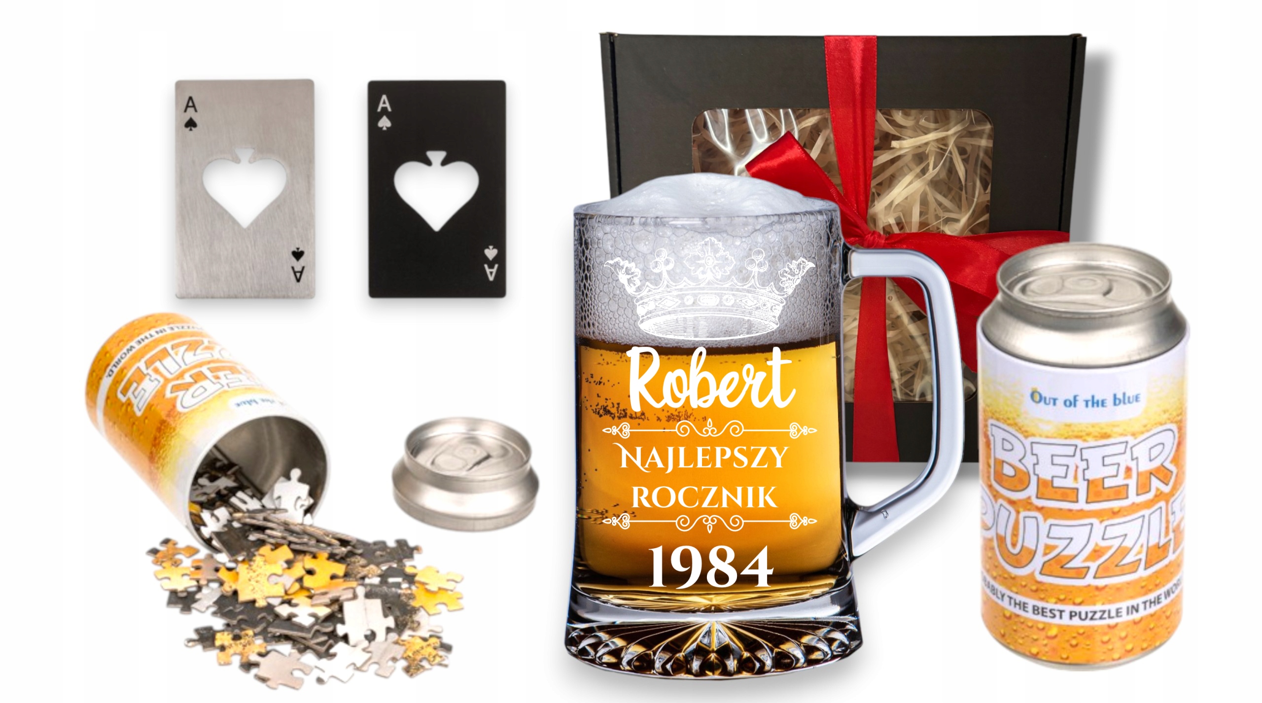 Zestaw Prezentowy: Kufel z Grawerem + Puzzle Piwo + Otwieracz Karta As – Idealny Prezent dla Piwożercy!