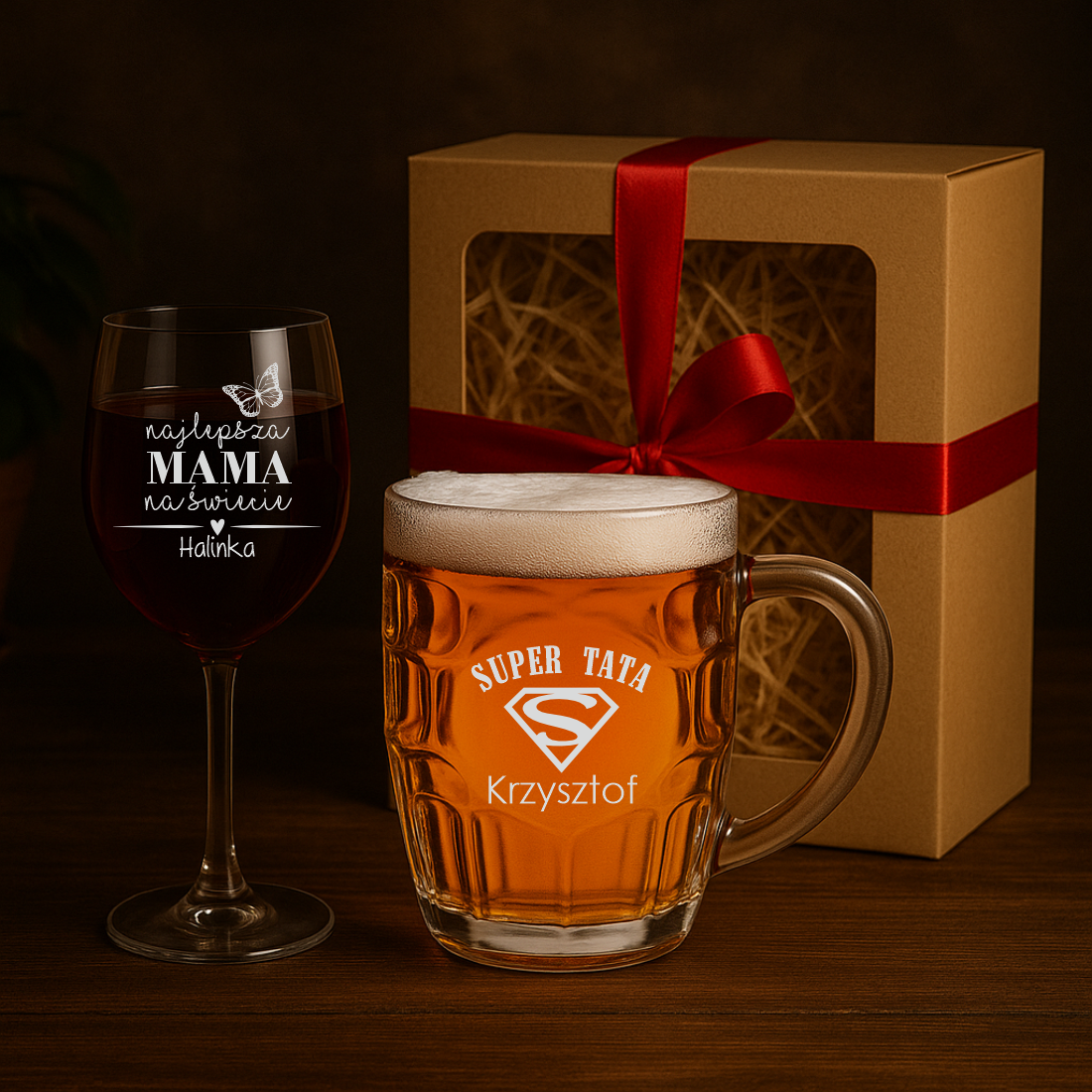 Zaskocz swoich bliskich unikalnym zestawem, który łączy tradycję i nowoczesny styl! Kufel do piwa i kieliszek do wina z personalizowanym grawerem to doskonały pomysł na prezent, który wyrazi Twoją wdzięczność i miłość.