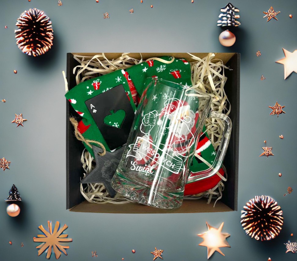 Zestaw Prezentowy: Kufel z Grawerem + Skarpetki Piwo + Otwieracz Karta As – Idealny Prezent dla Piwożercy!