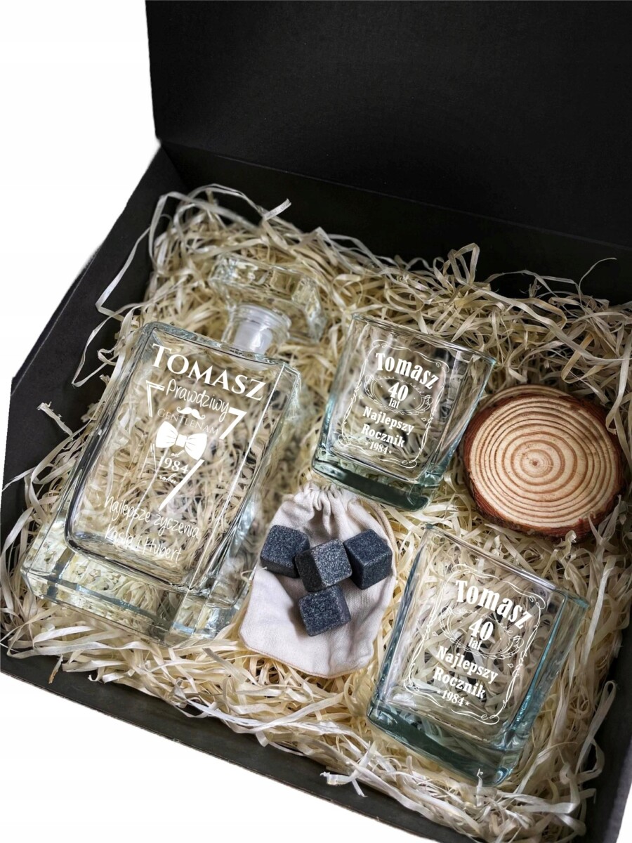Zestaw Prezentowy Karafka i 2 szklanki do whisky z personalizowanym grawerem wykonana z grubego szkła, zapakowana w pudełko wraz z drewnianymi podkładkami i kamienie do whisky!