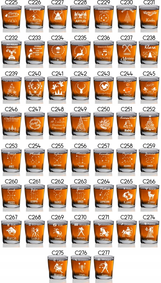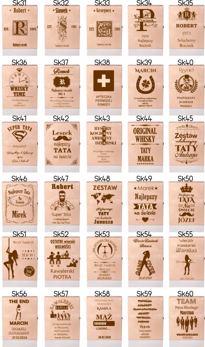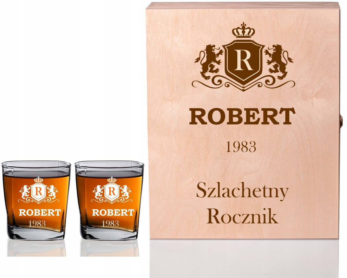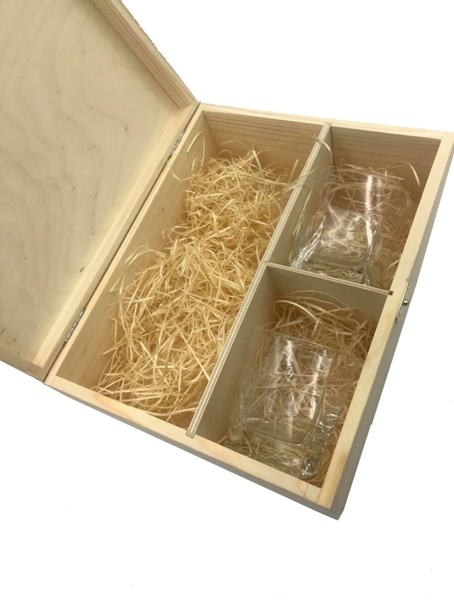 Możliwość zamieszczenia takich samych grawerów na skrzynce i szklankach. Wystarczy wszystko opisać w wiadomości podczas składania zamówienia.