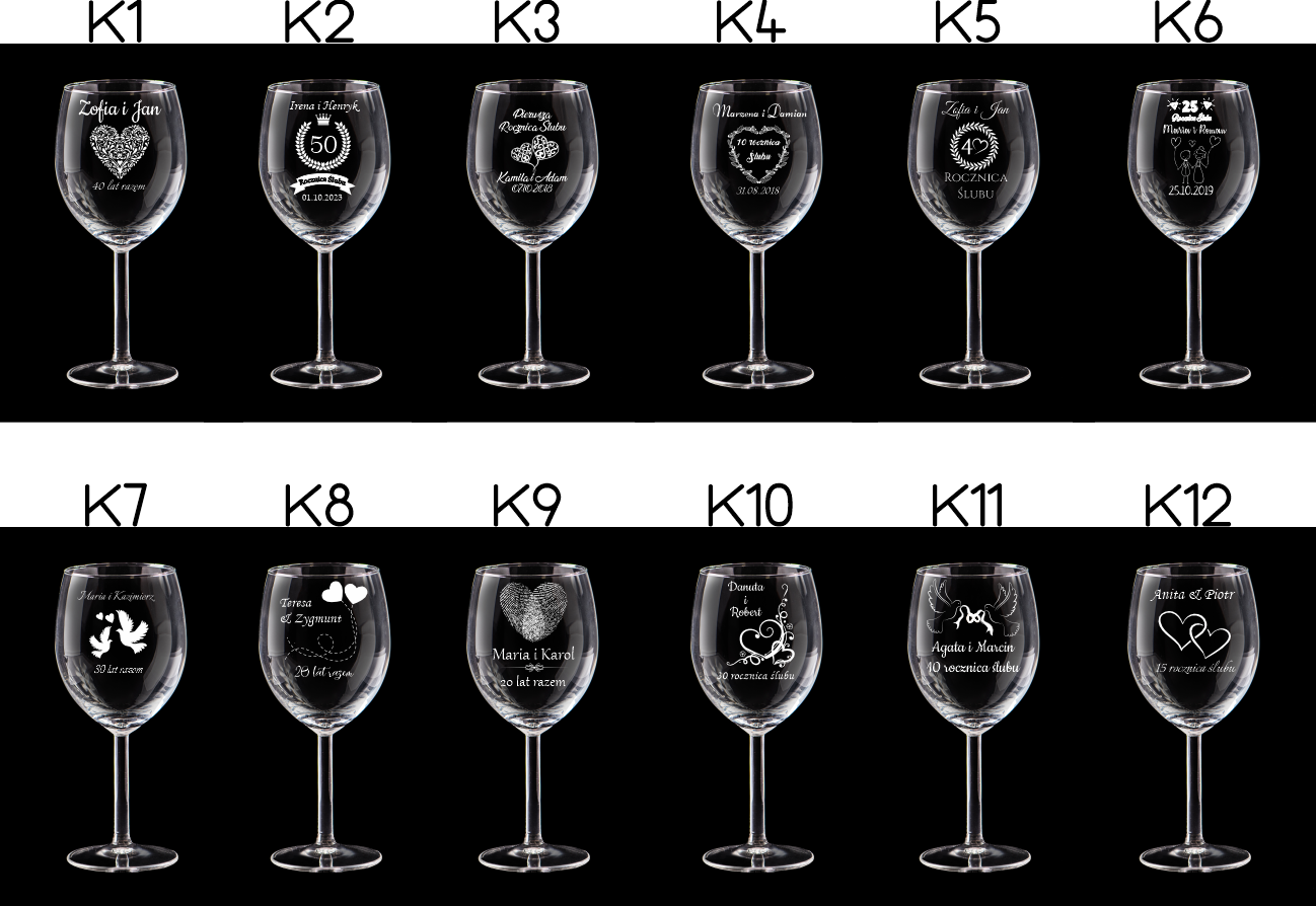 • komplet kieliszków 2 sztuki z grawerem (grawer w kolorze białym), pasujące do wina czerwona a także białego,