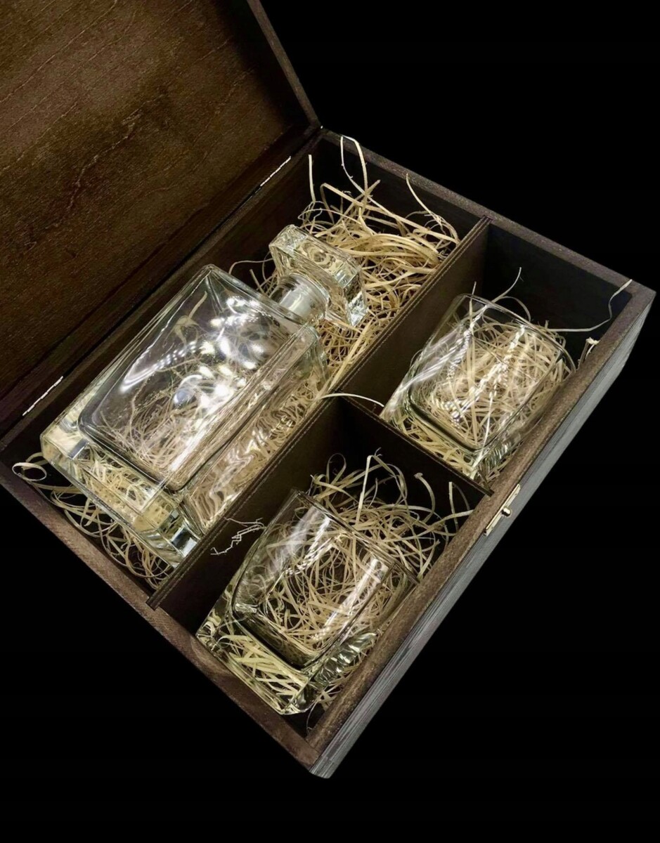 Możliwość zamieszczenia takich samych grawerów na skrzynce, karafce i szklankach. Wystarczy wszystko opisać w wiadomości podczas składania zamówienia.