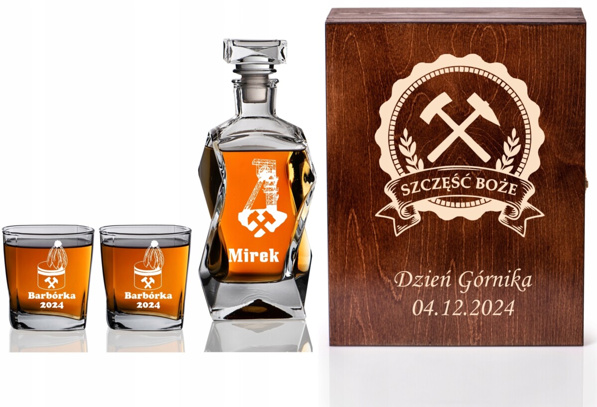 • SKRZYNKA KARAFKA SZKLANKI DO WHISKY GRAWER DZIEŃ GÓRNIKA ŚWIĘTA BARBÓRKA