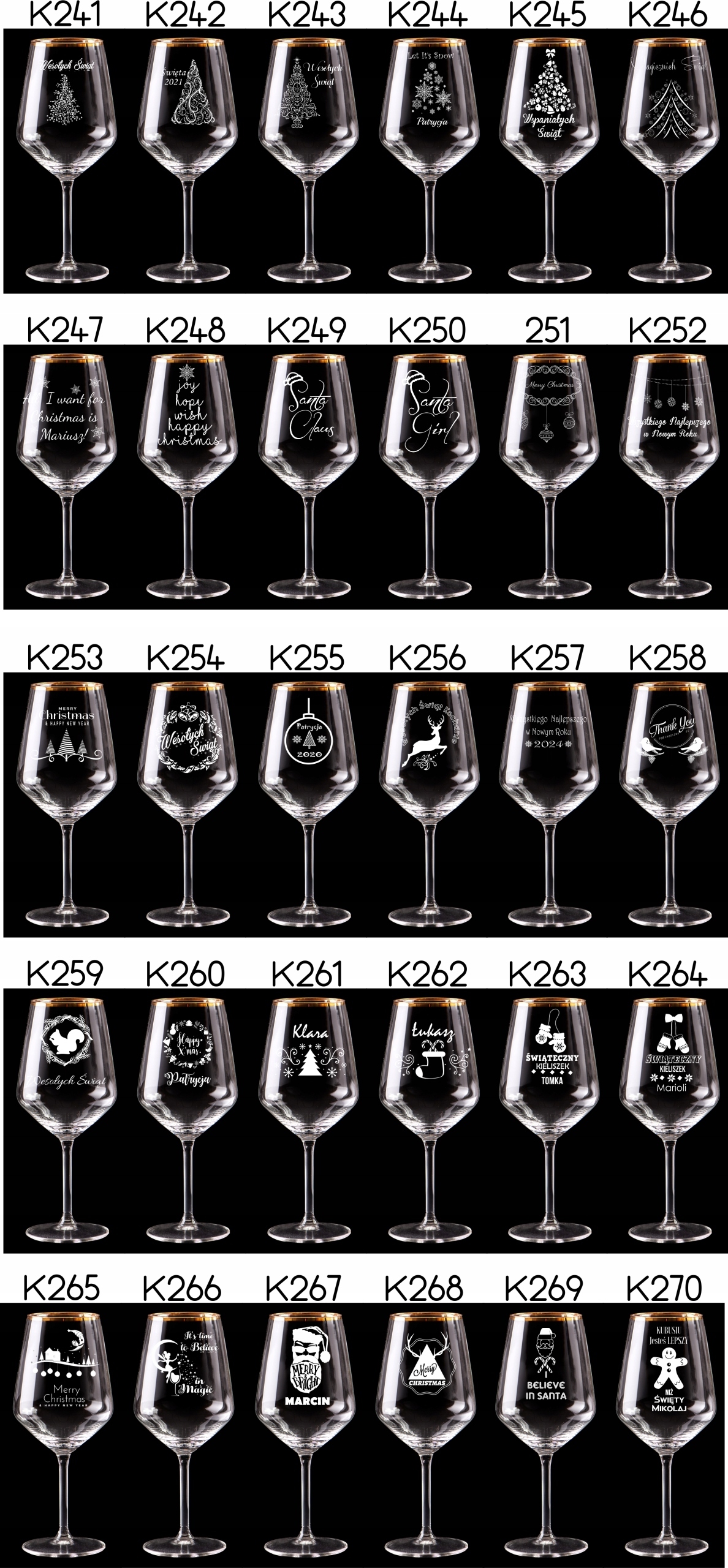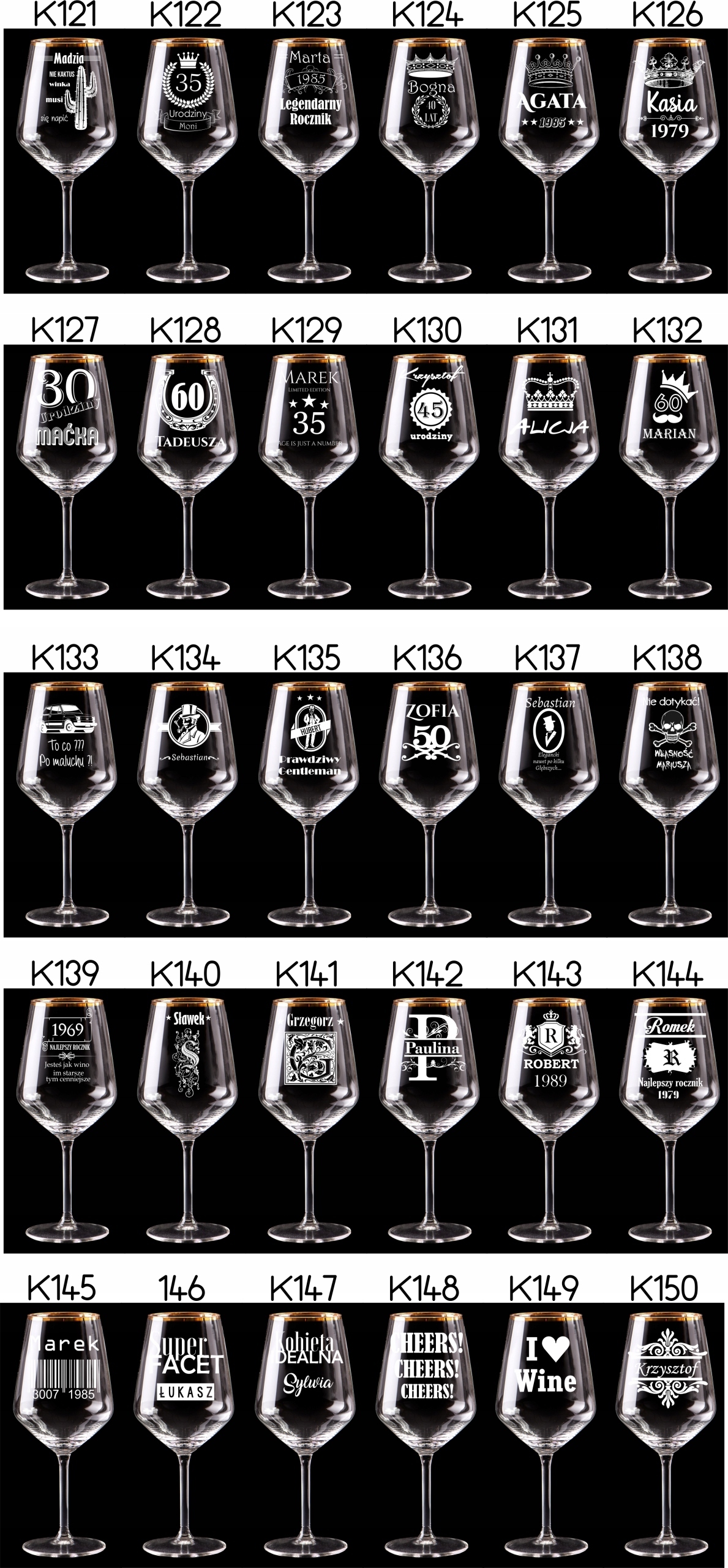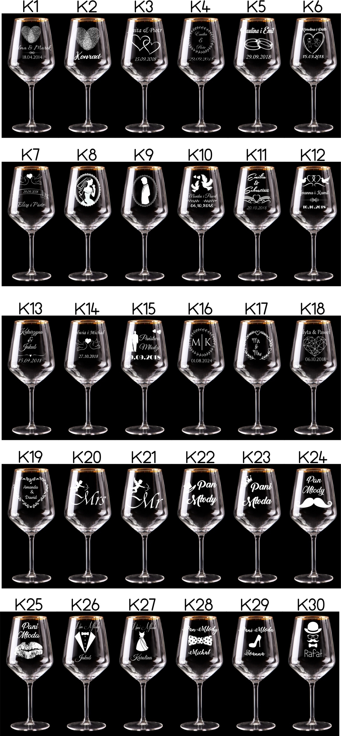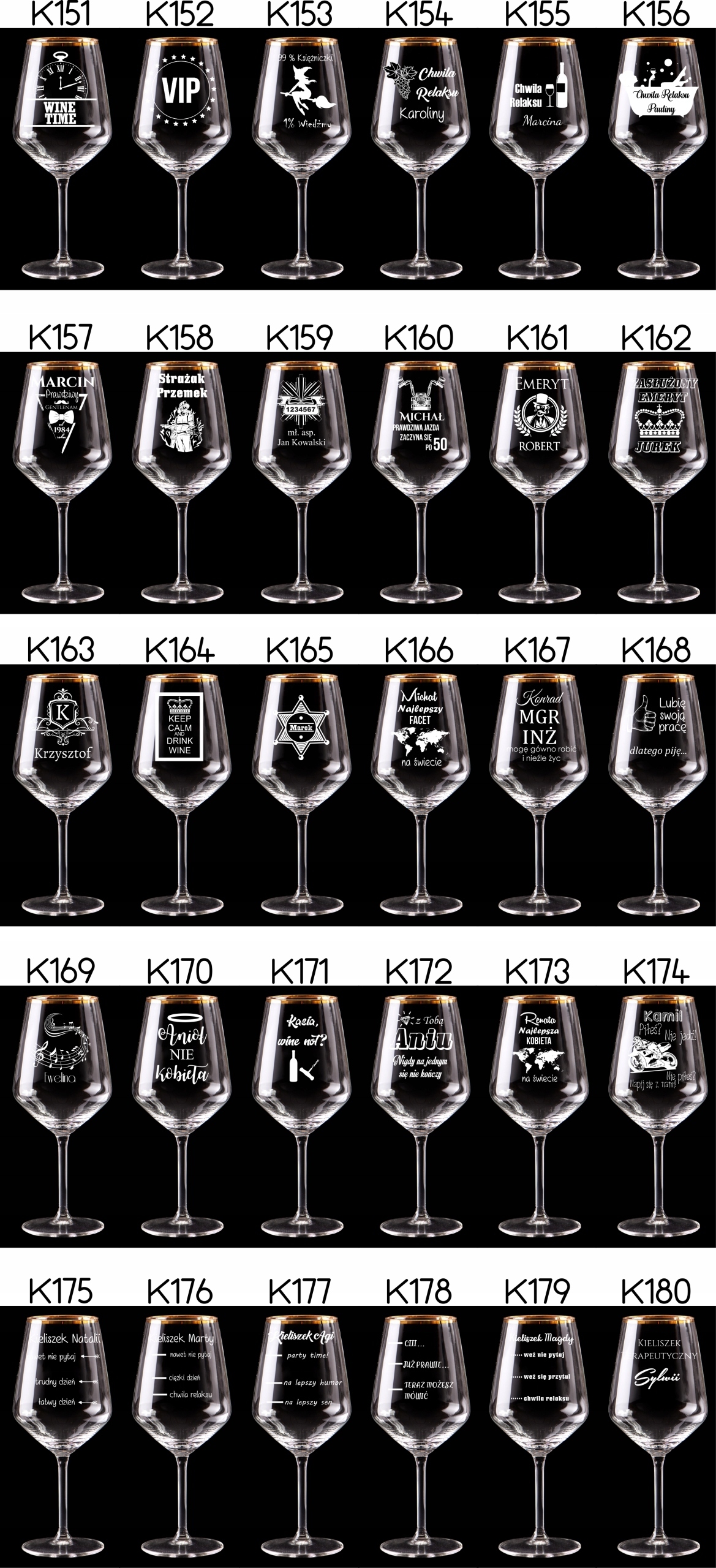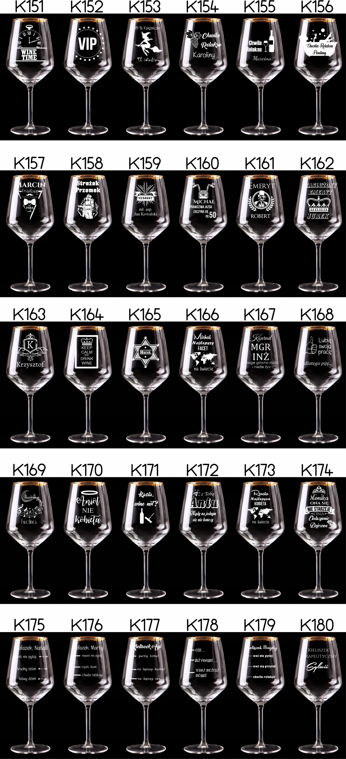 • kieliszek do wina białego lub czerwonego 1 sztuka 300 ml z grawerem (grawer w kolorze białym matowym),