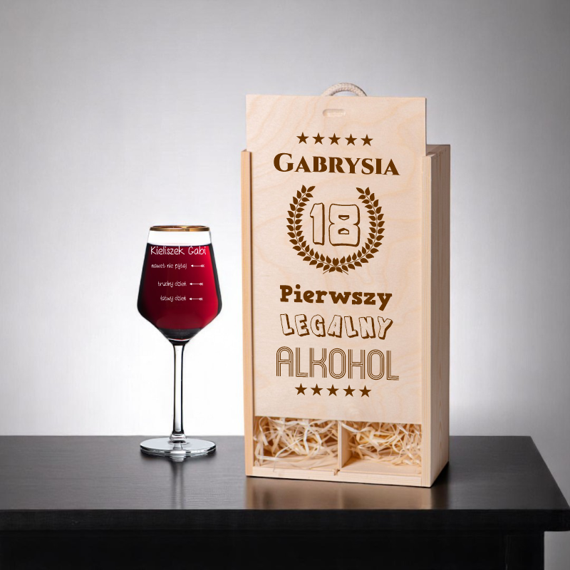 • Grawer i personalizacja na skrzynce i kieliszkach w cenie.