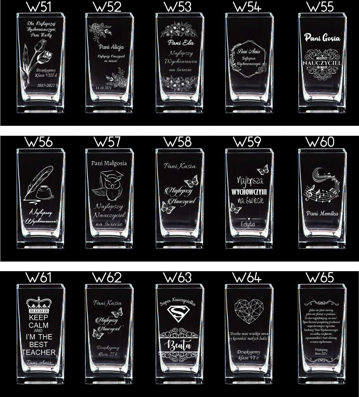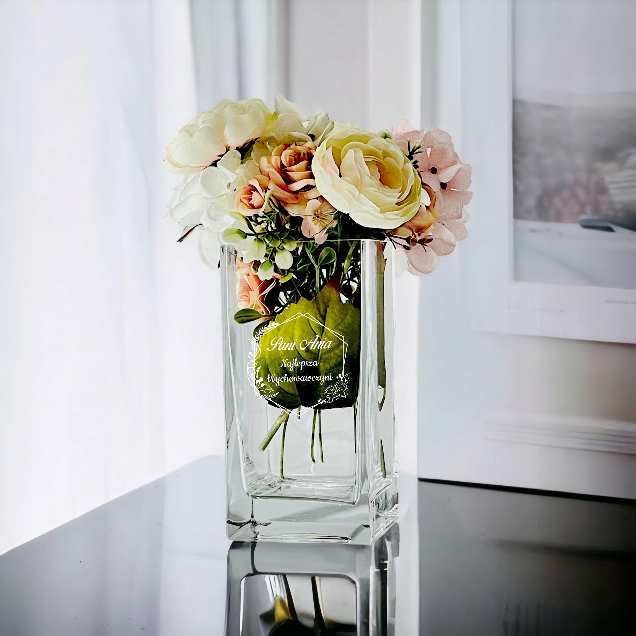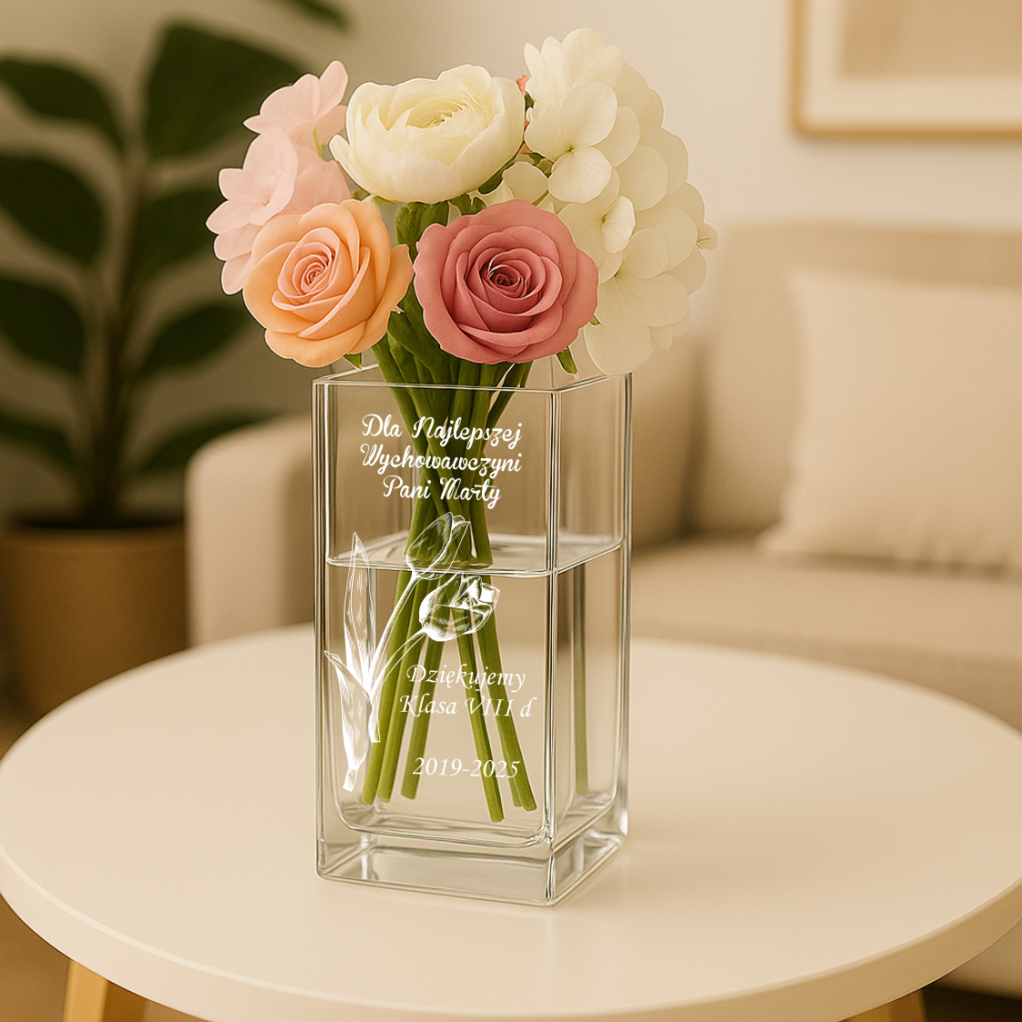 Wazon z grawerem to świetny pomysł na prezent dla Nauczyciela aby podarować komuś kwiaty w szczególnym i spersonalizowanym wazonie który będzie również świetną dekoracją domu!