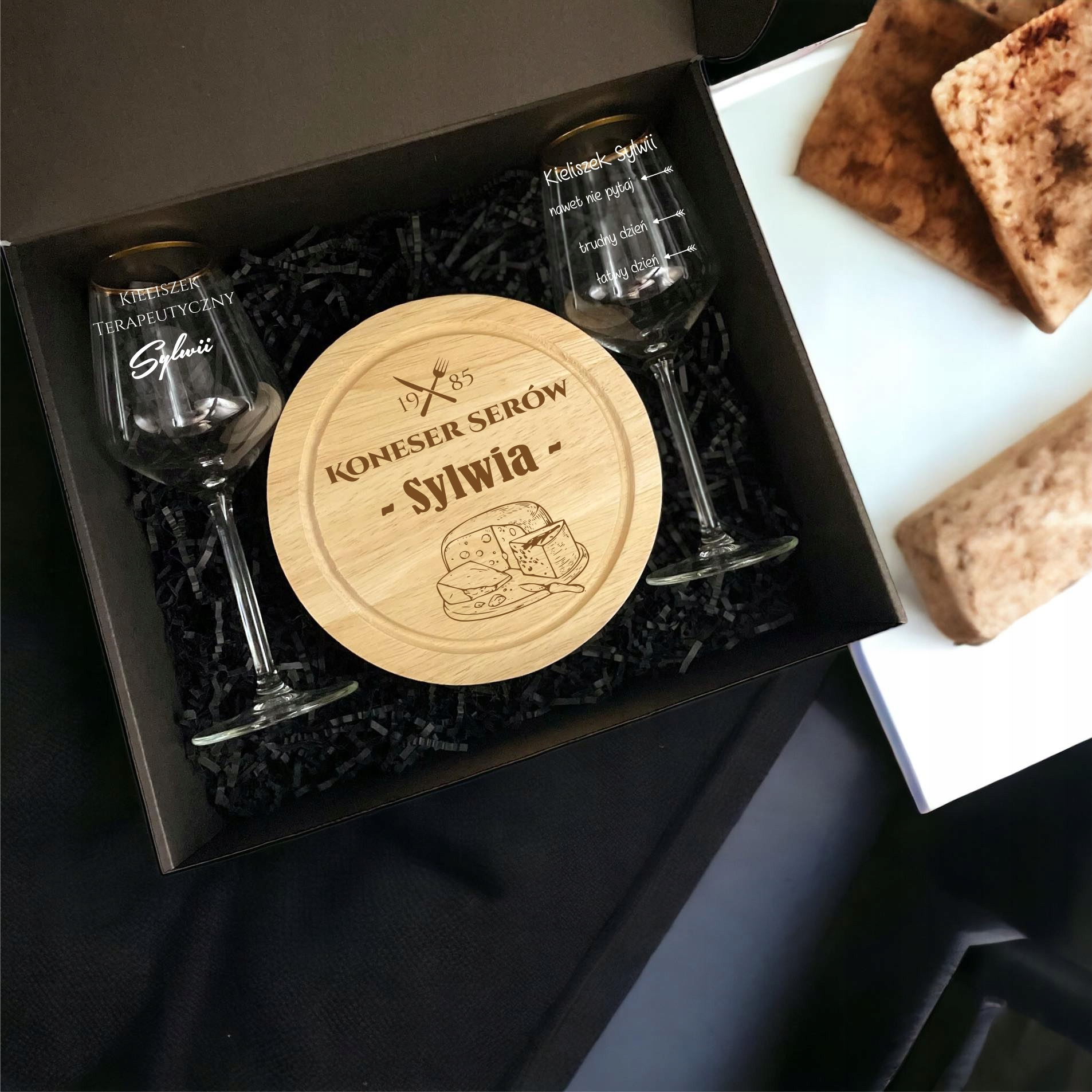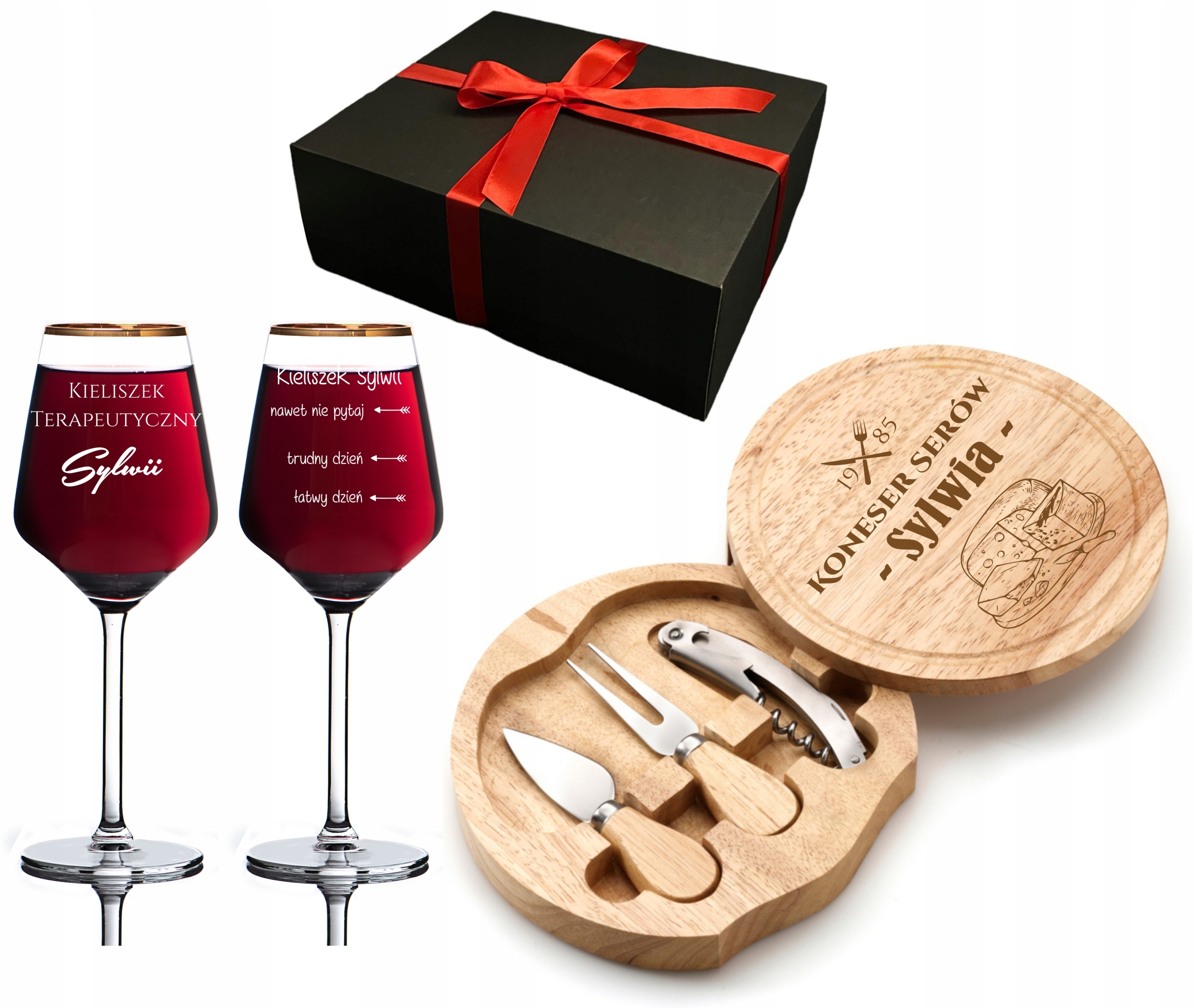 • ZESTAW KIELISZKI DO WINA I DESKA DO SERA Z AKCESORIAMI Z GRAWEREM URODZINY