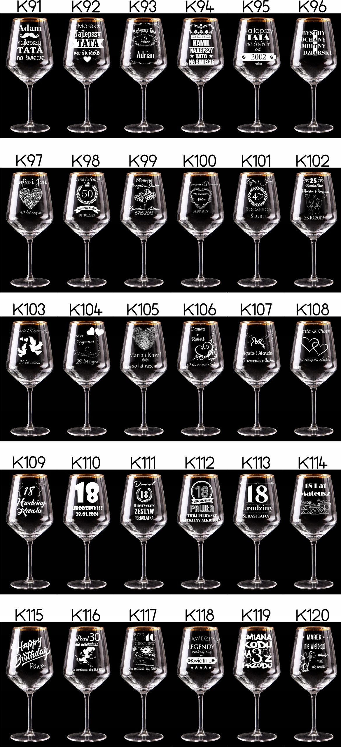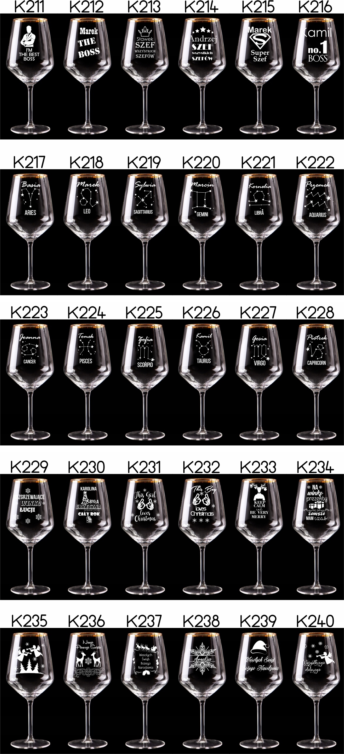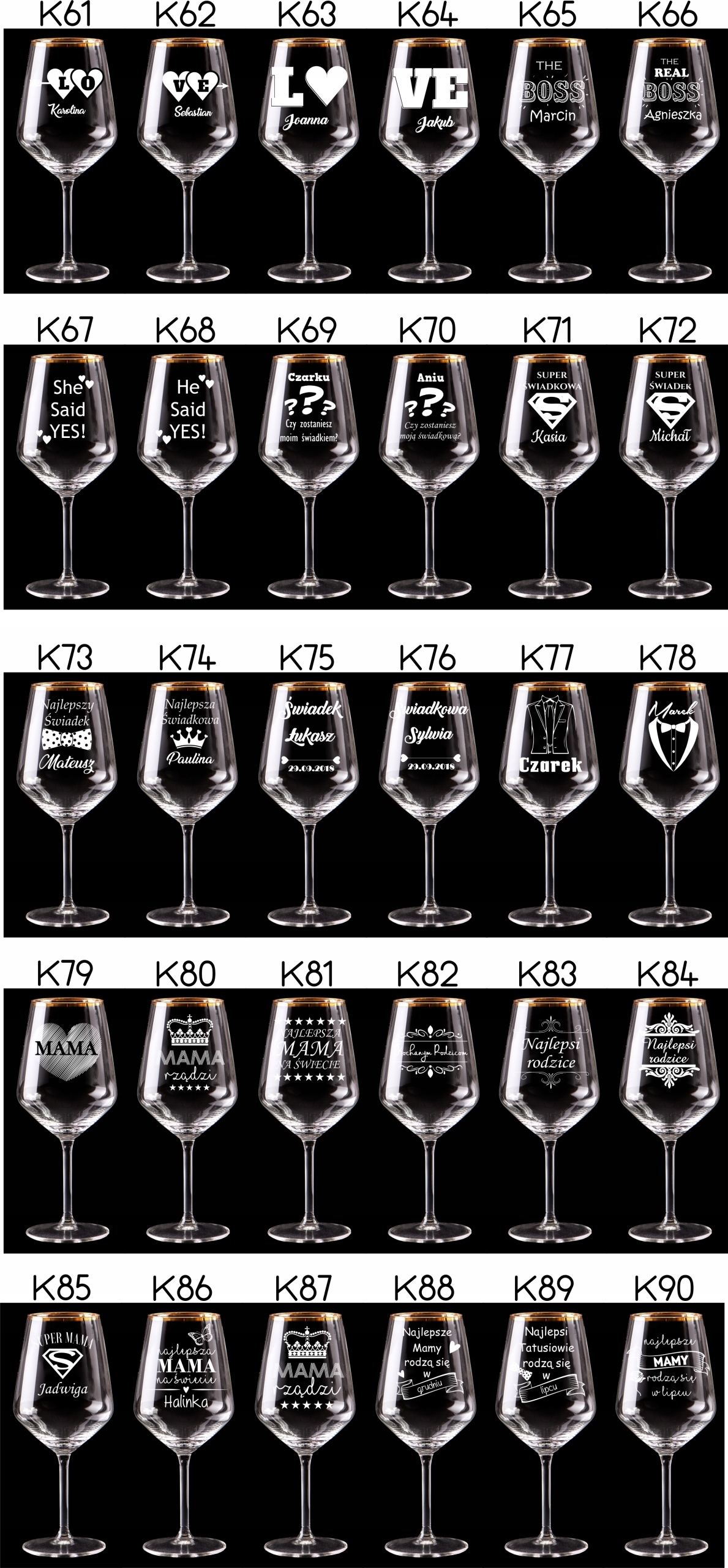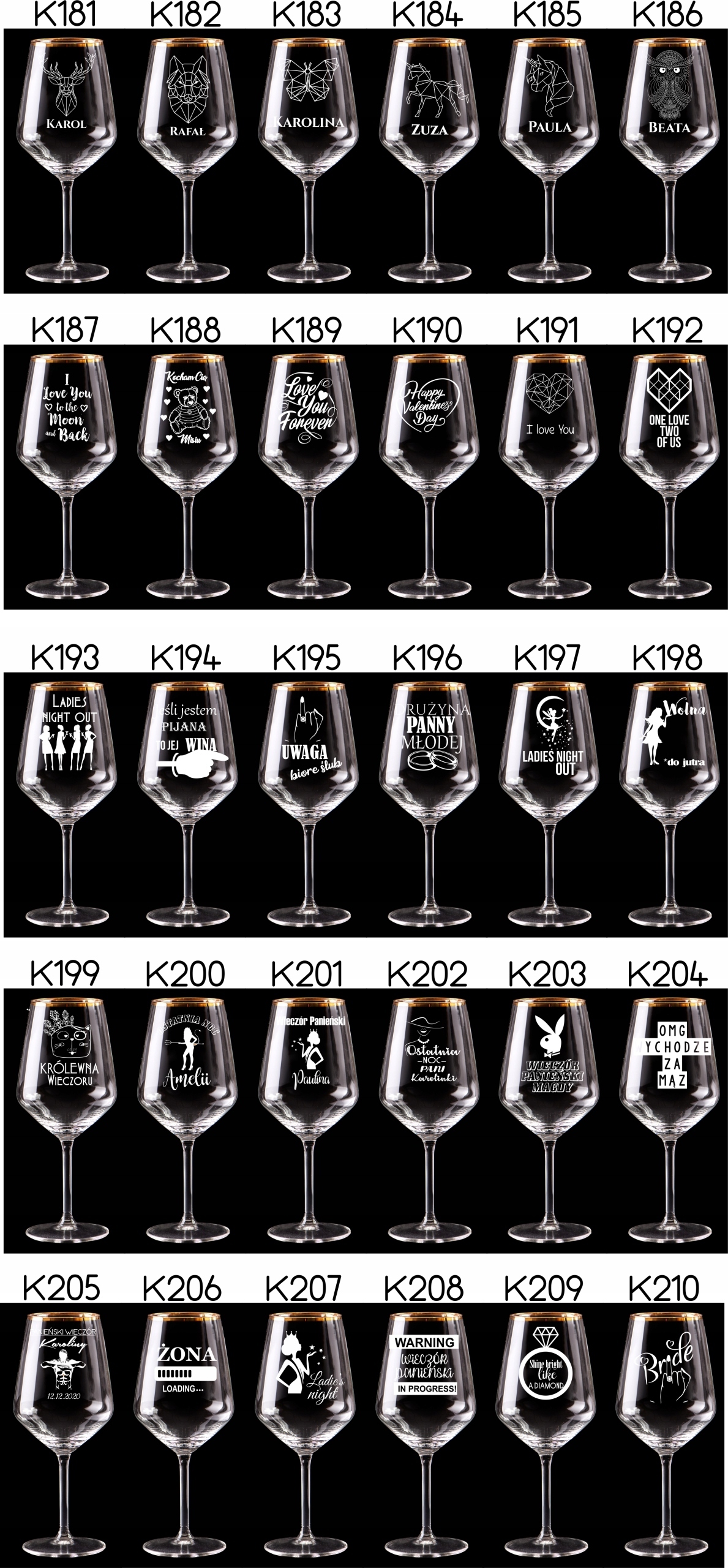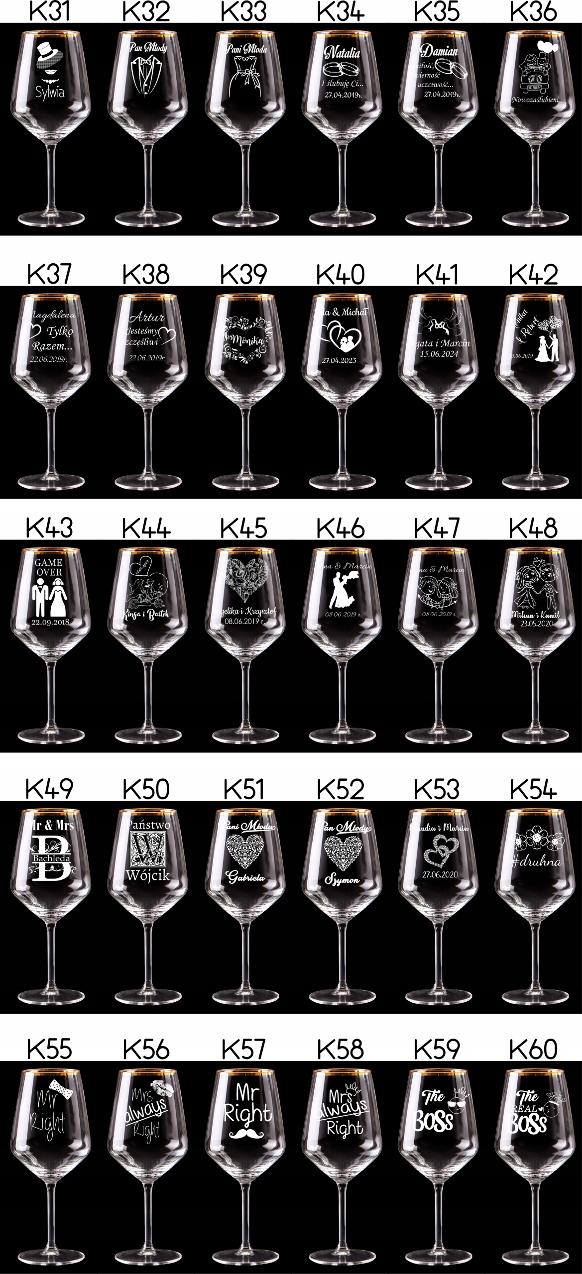 • Kieliszki do wina pojemność 370 ml o wysokości 22 cm, grawer w kolorze biały mat